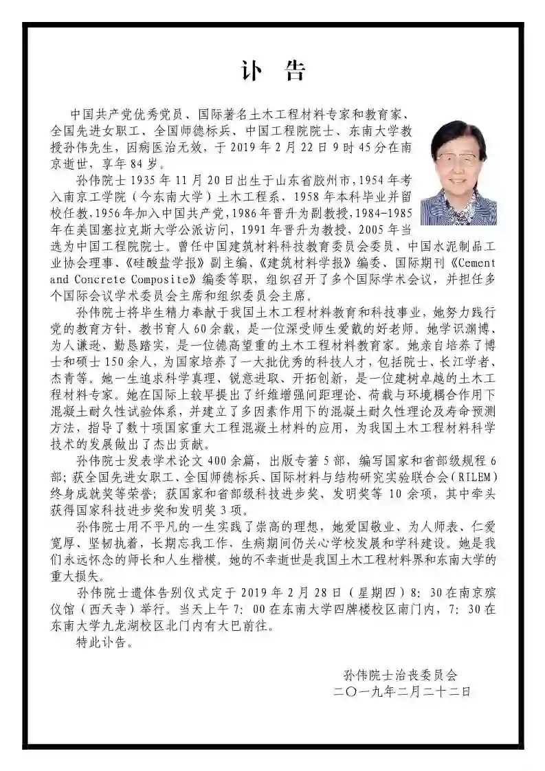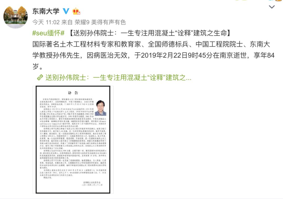 据@东南大学,国际著名土木工程材料专家和教育家、全国师德标兵、中国工程院院士、东南大学教授孙伟先生,因病医治无效,于22日9时45分在南京逝世,享年84岁。