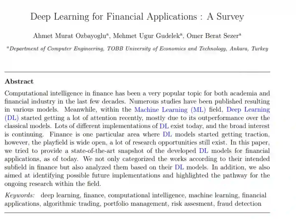 在过去的几十年里,金融领域的计算智能一直是学术界和金融界非常热门的话题。大量的研究已经发表,产生了各种各样的模型。与此同时,在机器学习(ML)领域,深度学习(DL)最近开始受到很多关注,主要是因为它在经典模型上的出色表现。当今有许多不同的DL实现,而且广泛的兴趣还在继续。金融是DL模型开始受到关注的一个特殊领域,然而,这个领域非常开放,仍然存在很多研究机会。在这篇论文中,我们试图提供当今金融应用的DL模型的最新快照。我们不仅根据他们在金融领域的意向子领域对作品进行了分类,还根据他们的DL模型对作品进行了分析。此外,我们还旨在确定未来可能的实现,并强调了该领域内正在进行的研究的途径。