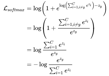LogSumExp函数值是大于等于max函数值的,而且等于取到的条件也是非常苛刻的(具体情况还是得看我的博士论文,这里公式已经很多了,再写就没法看了),所以使用LogSumExp函数相当于变相地加了一定的 m。但这往往还是不够的,我们可以选择跟hinge loss一样添加一个 ,那样效果应该也会不错,不过softmax交叉熵损失走的是另一条路:继续smooth。
