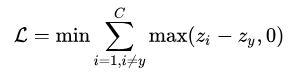 跟之前相比,多了一个限制词“最大的”,但其实我们的目标并没有改变,“目标分数比最大的非目标分数更大”实际上等价于“目标分数比所有非目标分数更大”。这样我们的损失函数就变成了: