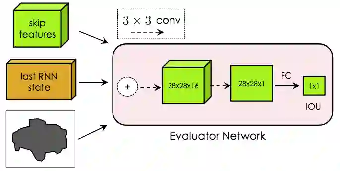 第一个顶点的选择很关键,特别是在有遮挡的情况下。传统的集束搜索基于对数概率,因此不适用于Polygon-RNN++(在遮挡边界上的点一般在预测时会有很高的对数概率,减少了它被集束搜索移除的机会)。因此,Polygon-RNN++使用了一个由两个3x3卷积层加上一个全连接层组成的评估网络: