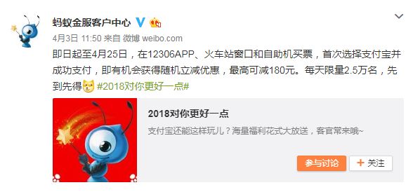 昨日,蚂蚁金服客户中心发布微博表示,“即日(4月3日)起至4月25日,在12306APP、火车站窗口和自助机买票,首次选择支付宝并成功支付,即有机会获得随机立减优惠,最高可减180元。每天限量2.5万名,先到先得。”