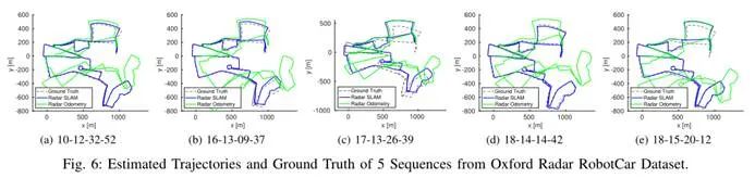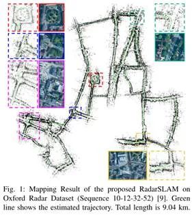 RadarSLAM 在Oxford Radar 数据集上的结果,绿线表示估计的位姿,总长度是9.04km.