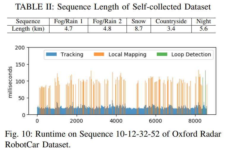 RadarSLAM 是使用C++实现的,没有使用GPU的情况下,在Intel i7 2.60GHz CPU上,16GB RAM上的笔记本运行速度是6Hz。一个37分钟的序列(约9000幅图像)是实时的。