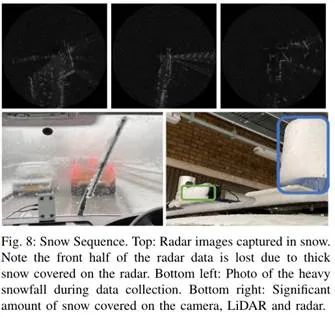 为了验证算法在极端天气的鲁棒性,本文作者采集了在雨、雪、大雾、夜间等非常有挑战的数据。数据采集车装备有GPS, IMU导航系统,一个Velodyne HDL-32 激光雷达,一个ZED双目相机,一个NavTech 雷达扫描仪。NavTech最大距离是100m,分辨率 0.1736 pixel/m, 和Oxford Radar Dataset中的有点不同。