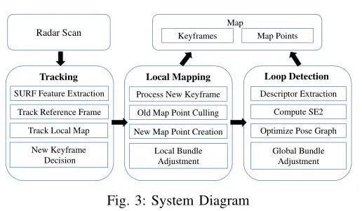 作者使用FMCW(调频连续波雷达)作为主传感器,可以同时测量距离与速度,并生成雷达图像。通过SURF特征点提取算法进行关键点的提取。利用描述子构建关键点的匹配,并利用深度信息提取了两个改进以减小不正确的匹配。