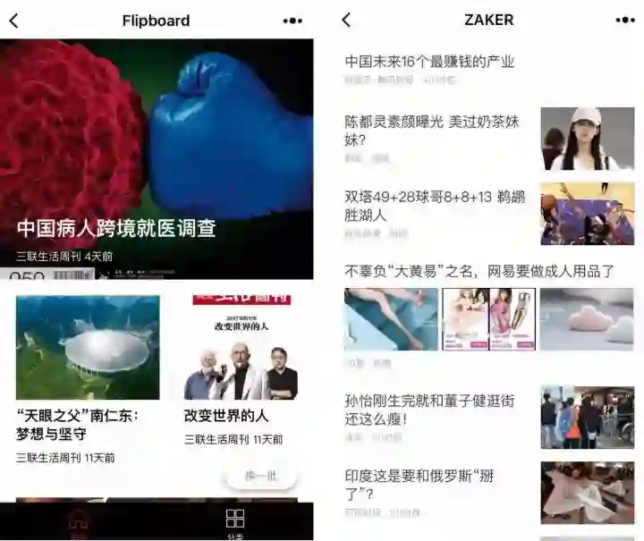 App中以内容聚合出名的Flipboard和Zaker在小程序方面的表现如何?榜妹试用“Flipboard日读”和“Zaker资讯”这两款小程序后,没有发现太多亮点。“Flipboard日读”的排版与App相似,但每次刷新只能显示同一来源的文章。而“Zaker资讯”跟微信“看一看”几乎是一个模子刻出来的。