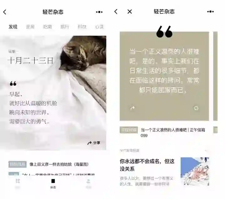 榜妹此前介绍过的“轻芒杂志”(点击可查看)应该是内容聚合类小程序中最优质的范例之一。在其他聚合类小程序显得比较随意的情况下,这款小程序则显得非常精巧,无论是杂质风的排版,还是人性化的功能,都让人感到愉悦和惊喜。