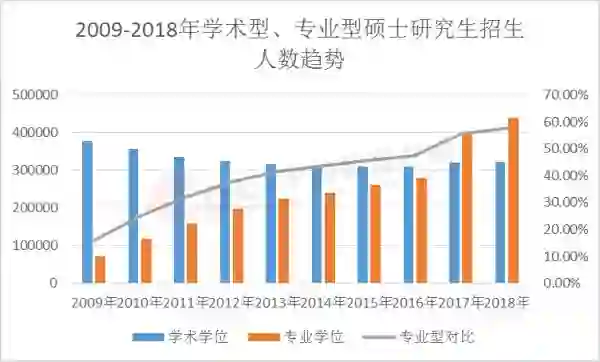 自2009年-2018年,专业型硕士研究生招生人数持续增加。专硕招生规模的增长,符合当前我国对研究生培养结构布局,满足我国经济发展需求。