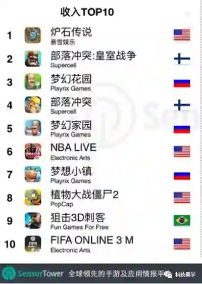 移动市场研究机构Sensor Tower今天发布了2018年Q1中国区App Store的海外手游产品收入榜,最吸金的海外手游为暴雪家的《炉石传说》,其次为《部落冲突:皇室战争》和《梦幻花园》。
