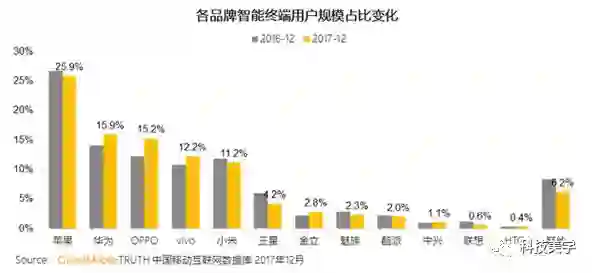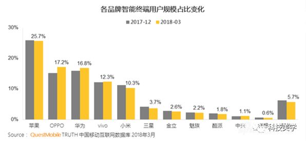根据大数据厂商QuestMobile近日公布的2018年第一季度中国移动互联网数据报告显示,今年一季度较去年年底相比,各品牌智能终端用户规模苹果稳居第一,而国内手机厂商华为、小米、OPPO、vivo竞争激烈。