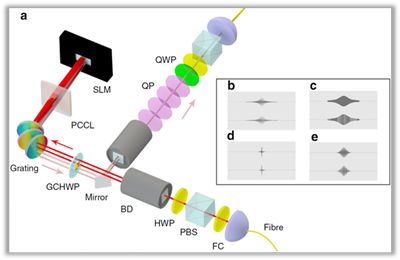 李传锋研究组在光学系统中完成了这一任务。他们把单个光子的偏振作为量子比特,而光子的频率作为环境,构造出完全可控相位演化量子模拟器。研究组通过巧妙的光路设计,把光子的频率分布转化到空间分布,并把两种偏振的光转变成两束平行光输入到空间光调制器上,通过对空间光调制器的编程控制可以构造出光子的任意频率分布和相位分布,从而实现任意的相位消相干过程。