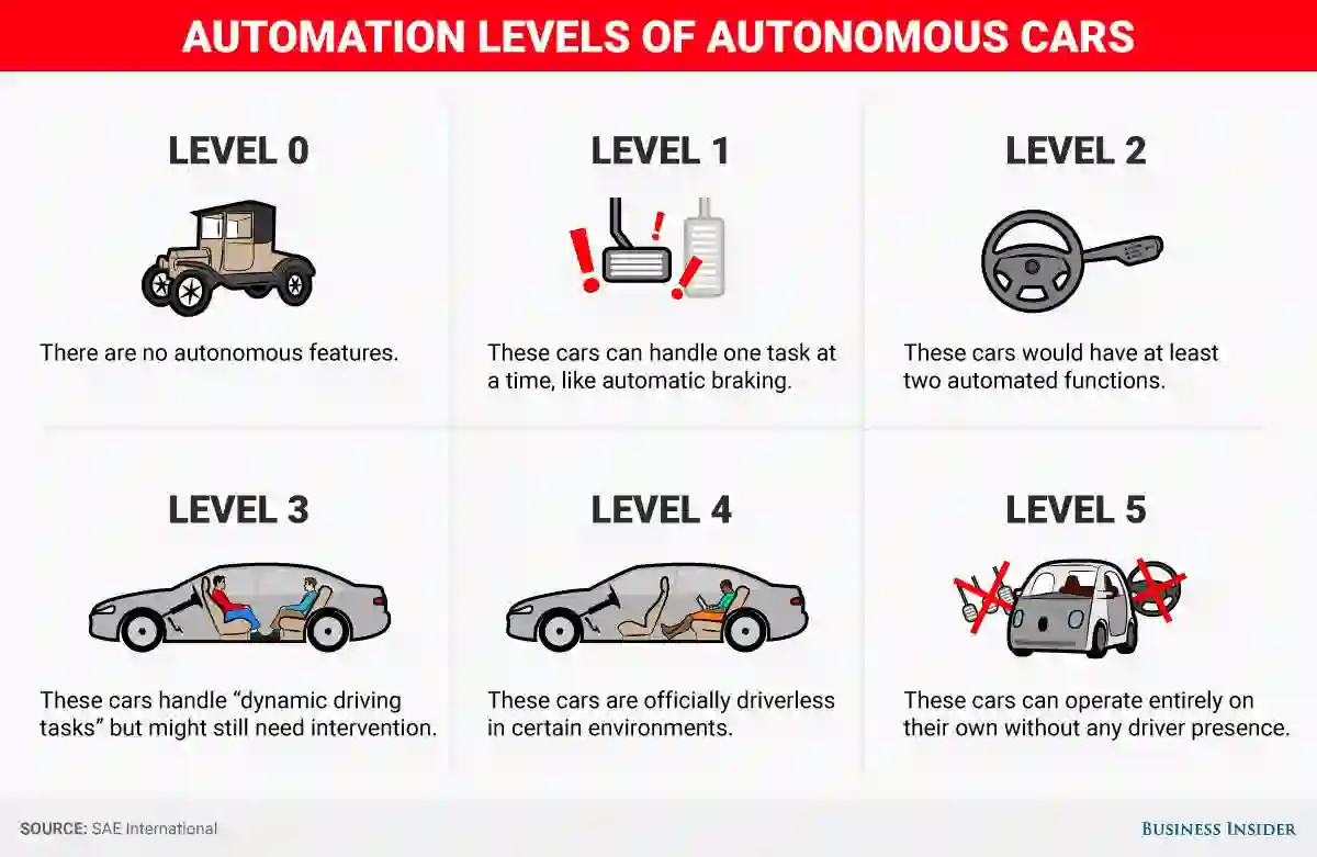 特斯拉和谷歌争论的基础,是自动驾驶过于宽泛的概念界定。目前,业界普遍采用的理论,是国际汽车工程师学会(SAE international)在2014年发布的自动驾驶的六级分类体系。它将自动驾驶分为从0到5六个级别,如下图所示:
