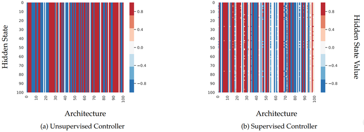 下图显示了 100 个采样架构的 RNN 控制器的隐藏状态(每行对应于单个架构的控制器隐藏状态)。请注意,在(a)中,即使采样架构不同,所有行也都是相同的,这表明控制器在隐藏状态下,不会对架构选择进行编码。