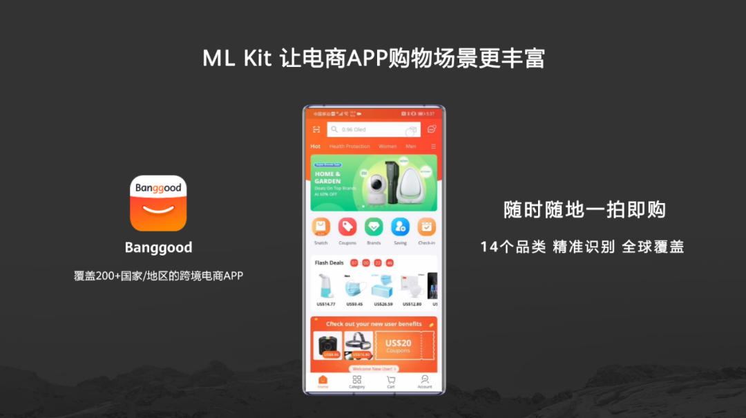 在实际使用中,可有效应用于电商购物等场景。Banggood,一个覆盖200多个国家和地区的跨境电商APP,便通过集成华为机器学习服务,构建了强大的图片处理能力,14种品类精准识别,随手拍下的好物即可追踪到同款商品下单,让全球用户体验到如此便捷流畅的购物新体验。
