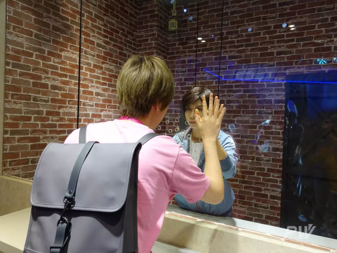 玻璃墙内有一位长得很像游戏里走出来的人物的小哥哥,体验观众可以把手放在玻璃上,感受对面放过来的一对一深情对视。观察了一会,大部分女生无法坚持 5 秒以上的对视。据悉,这也是 b 站即将上线的一款养成类游戏「无法触碰的掌心」。