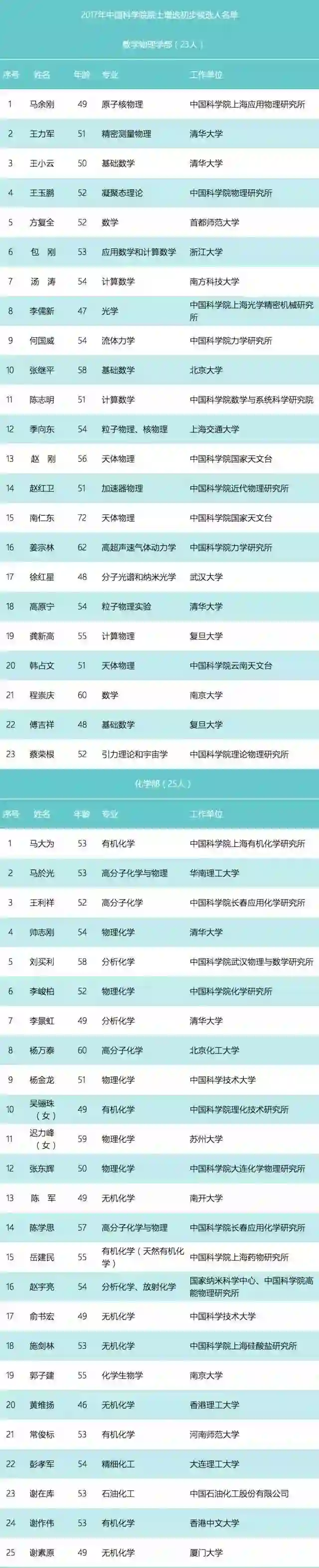 AI科技评论按:8月1日,中国科学院正式公布2017年院士增选初步候选人名单,共计有157人入选。在这157名初步候选人中,数学物理学部23人、化学部25人、生命科学和医学学部32人、地学部27人、信息技术科学部20人、技术科学部30人。