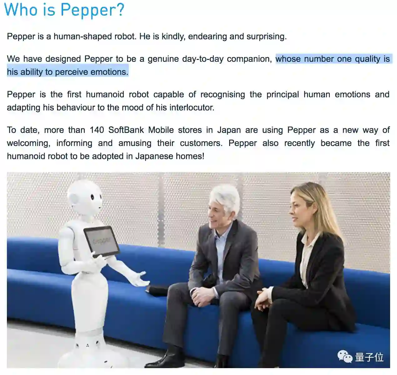 在软银的Pepper网站上,该公司还号称这款机器人拥有“一流的情绪感知能力”,而且已经进驻一些日本家庭。