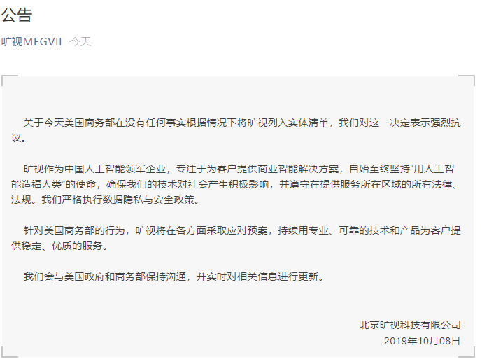 北京旷视科技有限公司公告称, 关于今天美国商务部在没有任何事实根据情况下将旷视列入实体清单,我们对这一决定表示强烈抗议。