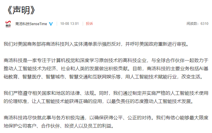 商汤科技在官微声明称,对美国商务部将商汤科技列入实体清单表示强烈反对,并呼吁美国政府重新进行审视。