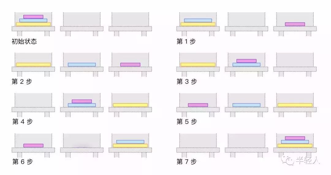 游戏目标是把第一把椅子上的三本书(或四本书,五本书,六本书……)全部搬运到第三把椅子上。
