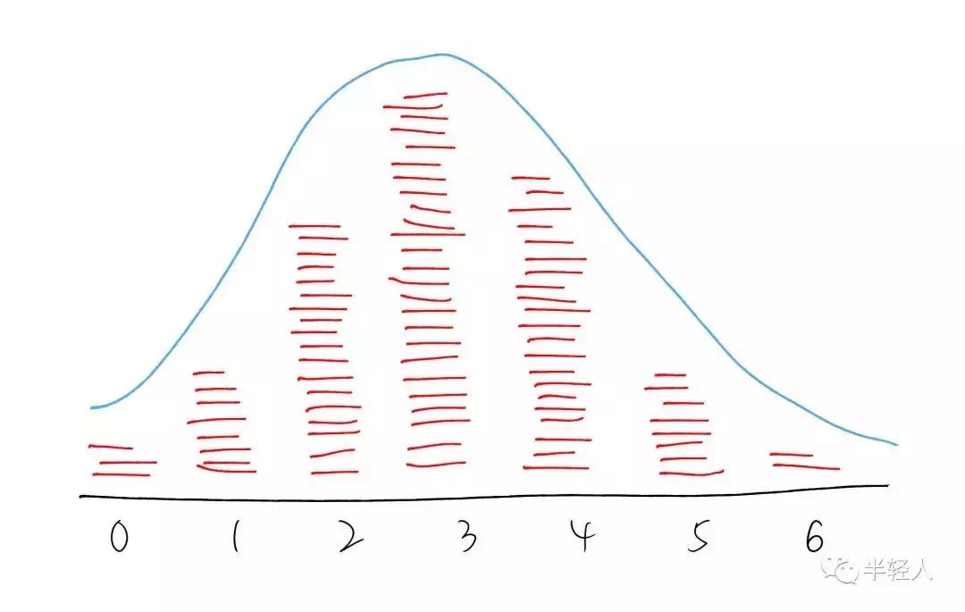 扔硬币次数比较多时,黑板上的正态分布图形就自然呈现在那里,特别直观,孩子很容易记住正态分布曲线(钟形曲线)的大致特征。