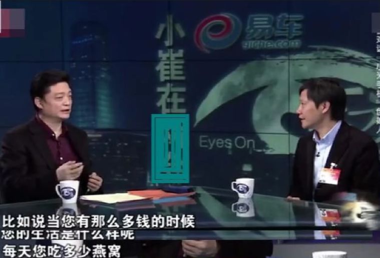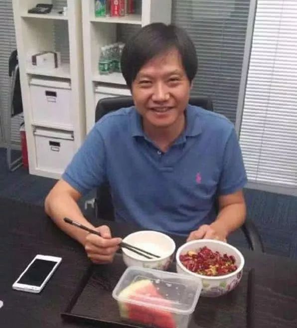崔永元曾经在一个节目上与雷军对话,问他“这么有钱每天吃多少燕窝”,雷军则表示“创业后每天忙得只能吃两个盒饭”。雷军其实没说谎,在网上可以找到一张雷军吃工作餐的照片,只是一份简单的辣子鸡、一碗米饭和几块西瓜而已。