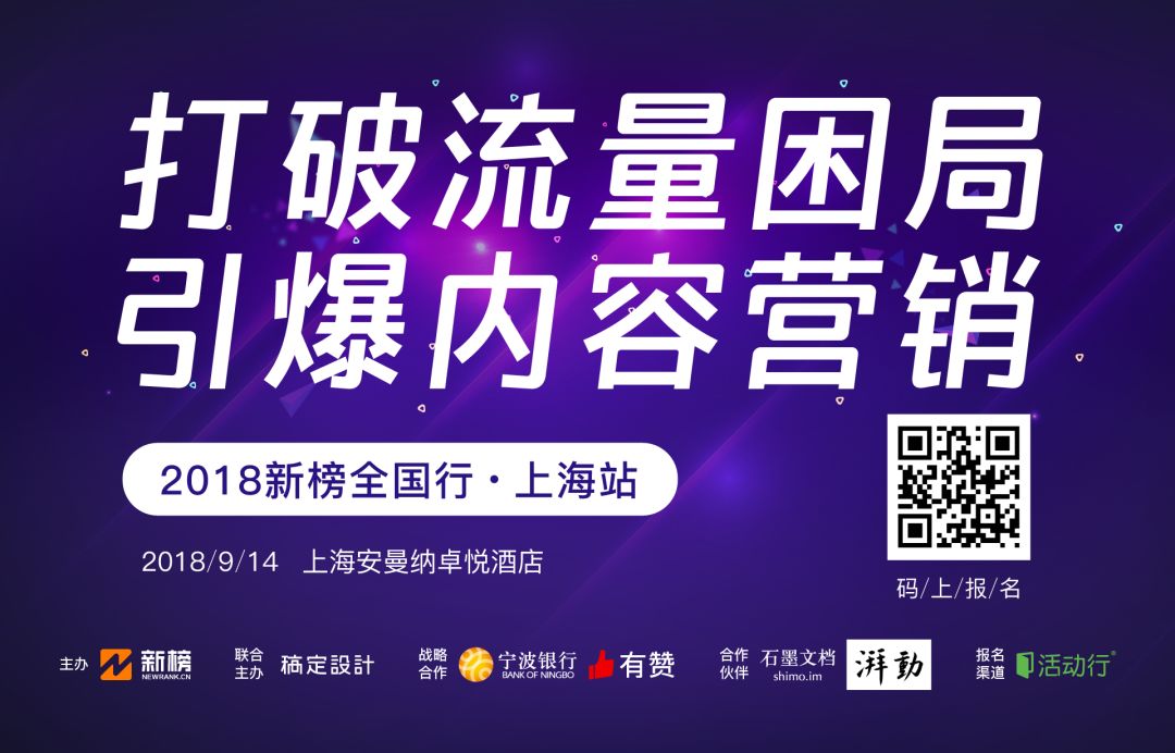 9月14日新榜联合稿定设计将在上海举办“打破流量困局 引爆内容营销”主题论坛,目前确认嘉宾有:新榜联合创始人兼总裁 陈维宇、有赞商家运营副总裁 冷面、湃动传媒创始人 沈帅波、稿定设计联合创始人 王晶、末那大叔联合创始人凿梦等,活动报名请扫码或点击“阅读原文”。