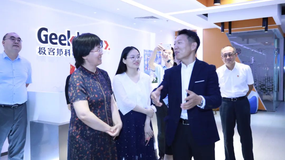 9 月 14 日,全国工商联、中国民营经济研究会、泽平宏观研究院等一行领导莅临极客邦科技(叶青大厦北园办公区)开展调研交流活动,叶青大厦党委书记张克成、极客邦科技创始人兼 CEO 霍太稳、极客邦科技联合创始人兼 COO 司巧蕾等陪同参观交流。