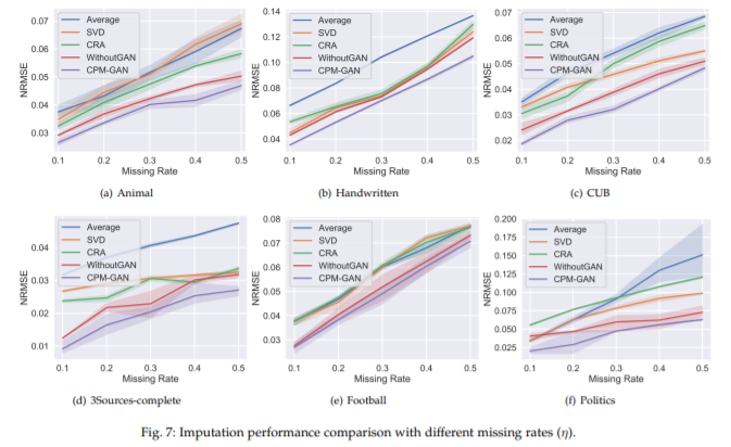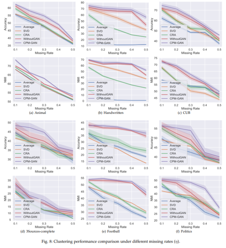其中,完整视图约束重建损失进行优化,缺失视图作为变量迭代更新。在原有GANmin-max损失的基础上,我们加入了对隐空间表示的min优化,形成min-max-min形式的目标函数。训练时采用迭代更新优化的策略,用统一的框架同时补全缺失视图并获得隐空间表示。通过实验验证,该模型在补全效果和下游任务上均具有明显优势。