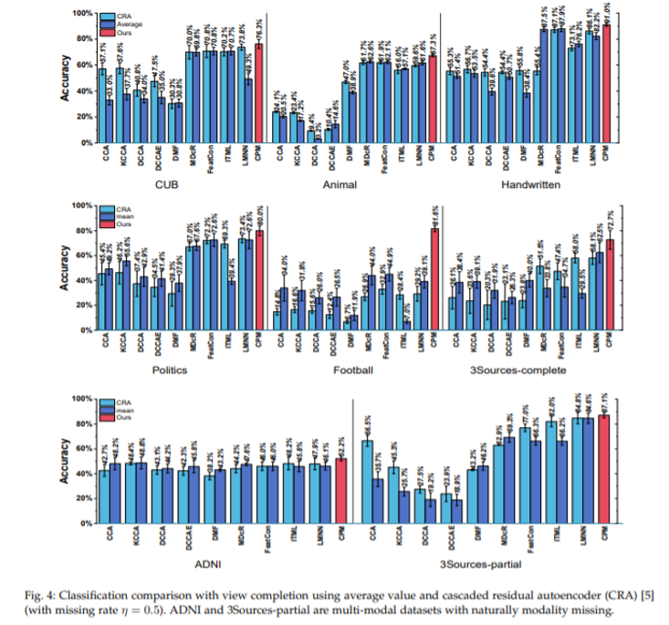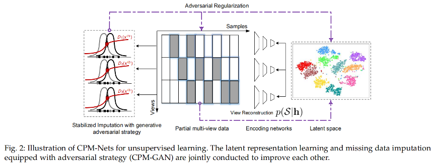 如Fig. 1所示,提出的跨缺失视图网络模型(CPM-Nets),通过构建隐空间表示还原完整视图,并根据结构化约束获得强泛化能力分类模型。