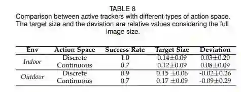 我们在两个真实环境中,分别测试了跟踪器执行离散动作和连续动作下的性能指标(每种跟踪器在每个场景中分别执行了十次),结果如下表所示: