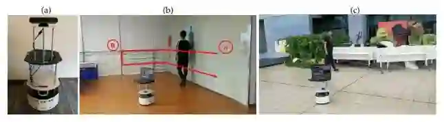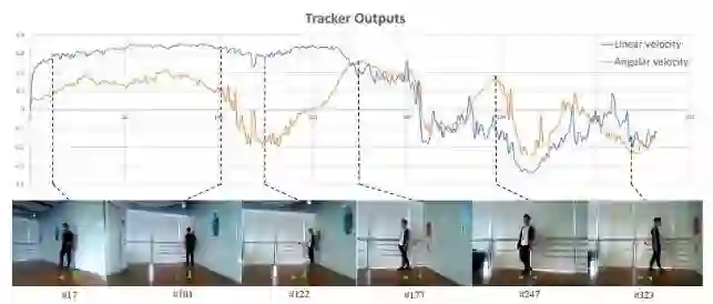 我们采用一个轮式机器人进行实验,如下图 (a) 中所示。机器人上方固定有一个 RGB-D 摄像头,离地面约 80cm 高。我们用一个带有 8 核 Intel CPU 的笔记本电脑作为计算平台,执行图像采集,神经网络的推理和传送控制指令至底层控制器等系列任务。每个 50ms (20Hz) 跟踪器的状态和动作会更新迭代一次。