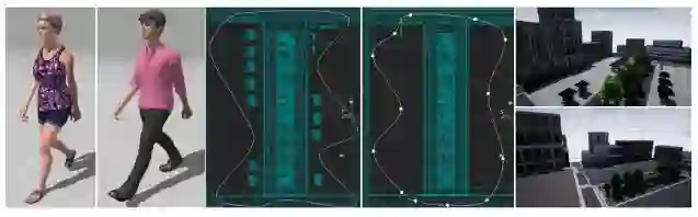 Unreal Engine 环境的地图和示例。从左到右分别为两种外观的目标(Stefani 和 Malcom),两种轨迹(Paht1 和 Path2)和地图(Square1 和 Square2),对应的两种场景的示例,通过不同组合构成了不同的跟踪场景。我们用其中一种组合进行训练,其余组合环境进行测试。