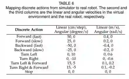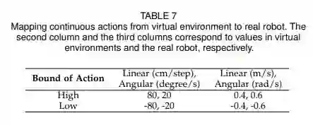 我们也对连续动作空间下的表现能力感兴趣,因此我们尝试了一种二维的动作空间,由线速度和角速度组成。具体的虚拟和现实的设置如下表: