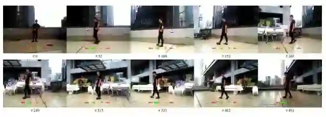 室内房间包括了一张桌子和反射的玻璃墙,玻璃墙会使得机器人在运动过程中观测到的背景发生动态变化。另外,墙上还贴了一张与目标外型接近的海报,可能会对跟踪者产生干扰。为了控制变量,目标将沿着红线进行行走。下图为执行连续动作的主动跟踪器在室内的演示序列。