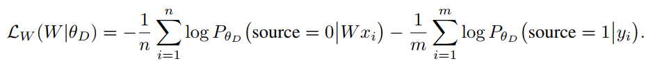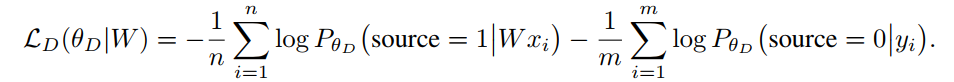 本文首先使用了领域-对抗生成(domain-adversarial)的方法来学习语言对之间的线性映射参数,判别器(Discriminator)目标在于判别向量来自于目标语言还是源语言映射,其目标函数如下: