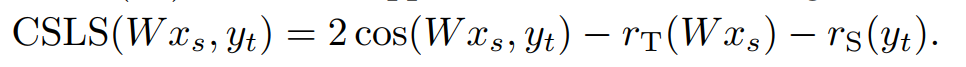 因为稀少词的向量表征并不稳定,会为训练带来噪声。所以这里只使用了高频词进行训练,同时使用self-training来进一步增加模型的准确率。也就是利用已经学习得到的W来自动标注对齐的词对,再利用这些词对进行训练学习。本文提出一种新的相似性度量的方法来产生词对,公式如下: