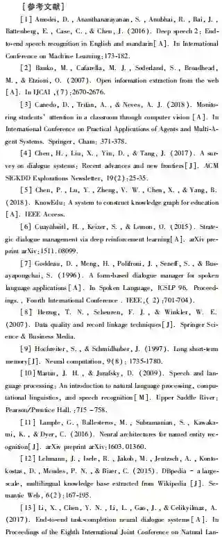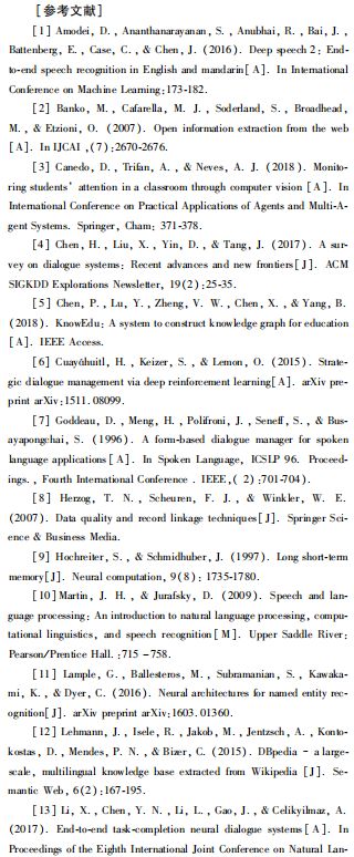 对话系统指能够与人进行连贯对话的计算机系统,可以采用文本、语音、图形、触觉、手势及其他方式与人进行交互,常以语音交互为主。在人工智能领域,模仿人类交谈能力的尝试可追溯到人工智能的早期阶段。1950年,艾伦·图灵提出了通过对话测试机器智能水平的方法,被普遍称为图灵测试或模仿游戏。近年来,大数据与人工智能技术的发展,尤其是深度学习的发展,极大地带动了对话系统的研究。从应用场景角度分析,对话系统主要分为两类:任务导向型对话系统和非任务导向型对话系统( Chen et al.,2017)。任务导向对话系统为实现特定任务而设计,它通过对话从用户端获取信息帮助其完成特定任务,常见的应用场景有机票预定、产品查询、在线客服等。与之相比,非任务导向型对话系统(又称闲聊机器人)没有清晰的任务,主要以模仿人与人之间非结构化会话或具有聊天特性的交互为目的( Martin& Jurafsky,2009)。本研究主要是基干任务导向型对话系统设计研发智能育人助理,因此以下主要讨论任务导向型对话系统的相关工作。