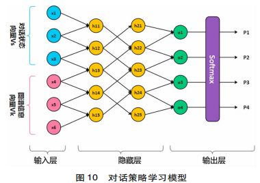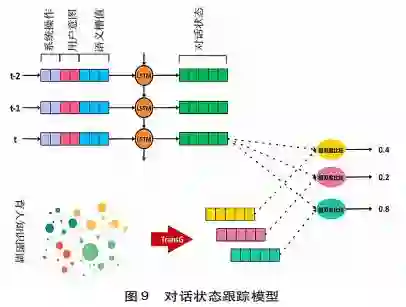 对话状态是对话系统内部对当前整个对话所处阶段的表示,融合了对话过程的上下文信息。传统的对话系统基于自然语言理解模块产生的结果,直接更新状态结构中相对应的语义槽,从而生成新的对话状态。然而,这种方法的容错性低,当自然语言理解模块识别出现错误时,此对话状态跟踪模块必然出现错误且没有办法加以更正。针对此问题,相关研究人员提出了基于概率模型的对话状态跟踪,即自然语言理解模块产生的结果不再是唯一的确定性结果,而是用概率表示每个语义槽的可能性。因此,对话状态的表示不再是0或1的二元表示,而是用概率表示每个状态的可能性。在状态更新过程中,根据上一时刻的对话状态和系统决策,及对当前用户输入的理解识别,重新计算新的对话状态。基于类似的理念,本研究设计了基于LSTM的深度学习模型(见图9)更新对话状态。LSIM的输入包括三方面信息:上一时刻的系统操作、当前的用户意图以及相应的语义槽信息。基于这三方面输人信息,结合上一时刻的对话状态向量,LSTM模型可以生成当前时刻新的对话状态向量。基于新的对话状态向量,此模块将进一步与知识图谱相结合生成潜在的答案选项,即利用知识图谱嵌入模型 Transg(Xiao et al.,2016)对知识图谱进行学习训练,生成关于每个育人问题的向量表示;通过与对话状态向量比较,计算每个问题与对话状态向量的相似度,并根据阈值选取相似的问题集,作为潜在的答案。