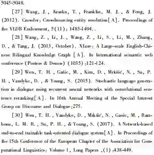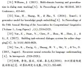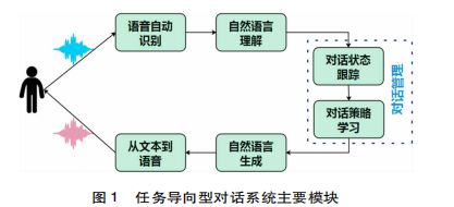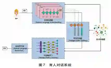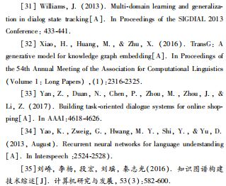针对任务导向型对话系统,传统研究主要基于管道( Pipeline)模型(见图1),包括:1)语音自动识别模块( Automatic Speech Recognition,简称ASR),负责识别用户的语音输入并转换成文本。传统的语音识别算法主要利用隐马尔可夫模型( Rabiner,1989)。近年来,随着深度学习技术的发展,深度神经网络模型应用于语音识别并取得了较好的效果( Amodei et al.,2016)。2)自然语言理解模块(Natural Language Understanding,简称NLU),主要负责对用户输入的文本进行语义理解,包括用户意图识别( Intention Detection)和语义槽填充( Slot Fitting)。意图识别通常转换为分类问题,近年来主要利用深度模型通过文本分类的方法判别( Tur et al.,2012)。语义槽的填充通常转化为信息抽取问题,利用序列标注算法识别。传统方法主要是基于条件随机场模型,近年来逐渐采用深度神经网络模型标注( Yao et al.,2013)。3)对话管理( Dialogue Manager,简称DM),负责整体对话的管理,包括对话状态跟踪( Dialogue State Tracking,简称DST)和对话策略学习( Dialogue Policy Leaming,简称DPL)。对话状态跟踪负责对当前对话状态信息的表征,通常以语义槽形式表示,同时基于识别的用户意图和语义槽值,更新对话。对话状态跟踪研究历经人工规则阶段( Goddeau et al.,1996)、统计概率模型阶段( Williams,2013),以及深度学习模型阶段( Mrksic et al.,2015)。4)对话策略学习解决如何根据当前的对话状态,生成系统的下一步操作可以利用基于规则与监督式学习相结合的方式( Yan et al.,2017),或利用深度强化模型( Cuayahuitl et al. 2015)。5)自然语言生成( Natural Language Generaion,简称NLG)主要负责根据对话策略选择系统操作,依据模板或当前流行的深度生成模型生成用户可以理解的自然语言文本,( Wen et al.,2015)。从文本到语音( Text to Speech,简称TTS)主要负责把生成的自然语言文本转换成语音输出。近年来,随着端到端深度模型的发展,许多研究者提出基于端到端深度学习框架的任务导向型对话系统,可以从整体上对系统进行共同优化( Wen et al.,2017)。