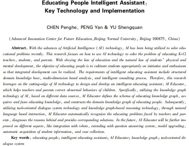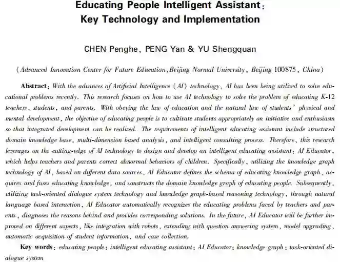 ( Canedo et al.,2018)。循环神经网络善于捕捉数据的前后依赖关系,常被用于序列数据的处理。针对学生知识状态评估的深度知识跟踪模型就是利用循环神经网络算法实现的( Piech et al.,2015)。行为主义学派认为智能是对外界复杂环境的适应,主要基于“感知一行动”行为模型模拟智能,代表性工作是增强学习,适用于各种决策场景,如智能教学系统如何为学生选择学习路径。在教育领域,人工智能不仅可用于解决适应性学习等问题,也可用于助力破解长期制约教育发展的关键问题。教育过程中,学生经常会出现上课故意捣乱、欺负同学等问题行为,如何解决这些问题,需要具备心理学、教育学、社会学、生理学等专业知识,但一般教师和家长通常不具有多学科完备的知识,难以对学生进行良好的教育引导。本研究针对此难题,利用人工智能技术设计和开发智能育人助理系统,帮助教师和家长矫正孩子的问题行为,引导孩子健康成长。