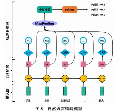 自然语言理解模块主要是对用户的输入文本进行语义理解,包括两方面:一是对用户意图的理解,如用户是想提出问题,还是回答系统的问题;二是针对用户的输人依据图谱定义的知识结构进行语义槽填充,如用户回答学生的年级是三年级时,需要识别出语义槽“年级”对应的值是“三年级”。语义槽填充的本质问题其实是序列标注问题,即针对用户的输入语句识别哪些词表示相关语义槽数值。针对自然语言理解的模型设计,常用的方法是构建两个不同的模型分别识别用户的意图和进行语义槽填充。最近,有研究尝试利用模型对两项任务同时进行优化求解,提高自然语言理解的准确率( Li et al.,2017)。因此,本研究采用类似的方法构建模型,先利用LSTM模型对输入文本进行语义解析,然后用分类模型和CRF模型对用户意图和语义槽识别标