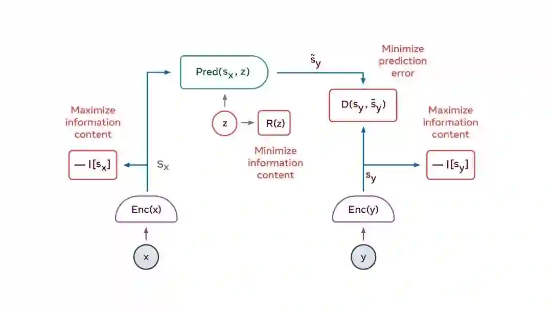 这些准则可以通过各种方式转化为可微的代价函数。其中一种方式是VICReg方法,它是「方差、不变性、协方差正则化」(Variance, Invariance, Covariance Regularization)的缩写。