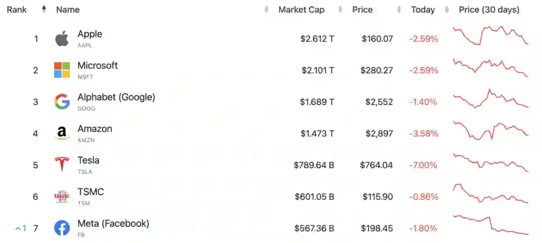 第四季度财报公布后,Meta市值一夜蒸发2000多亿美元。不管怎么说,现在Meta市值排名也算是回归前十。