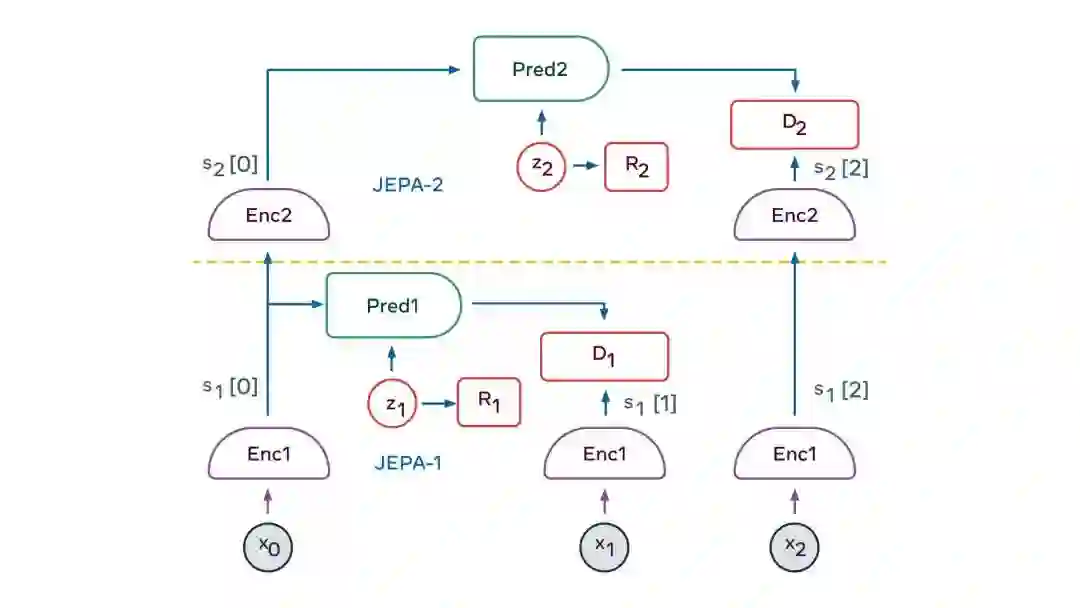 这使得JEPA可以相互堆叠,用来学习具有更高层次的、能藉以执行更长期预测的抽象表示。