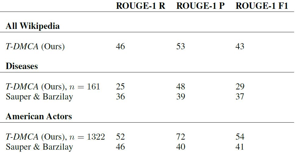 表 7:与 Sauper 和 Barzilay(2009)的论文中的结果比较。请注意,谷歌大脑这篇论文中的的结果是维基百科主要部分的报告,而 Sauper 和 Barzilay 的是文章的报告。