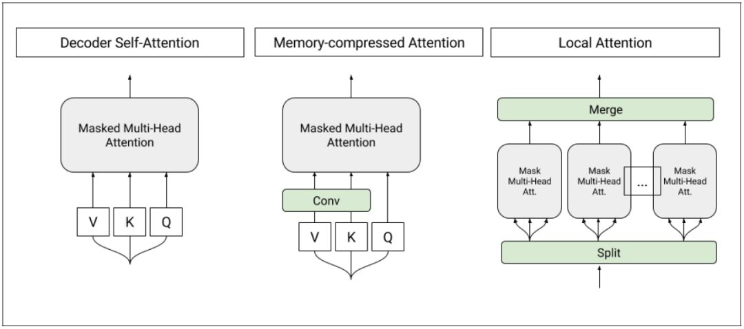 图 1:T-DMCA 模型中使用的自注意力层架构。每个注意力层都将一个符号序列作为输入,并产生一个相似长度的输出序列。左图:transformer-解码器中的原始自注意力。中图:内存压缩的注意力,减少了密钥/数值的数量。右图:将序列分割为单个较小子序列的局部注意力。之后子序列合并在一起得到最终输出序列。