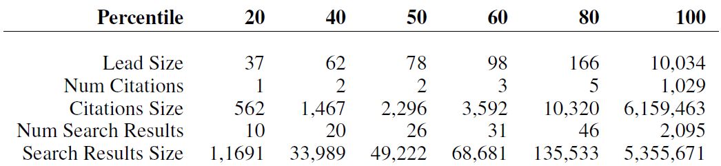 表 2:WikiSum 数据集不同属性的百分比,大小以单词数量为单位。