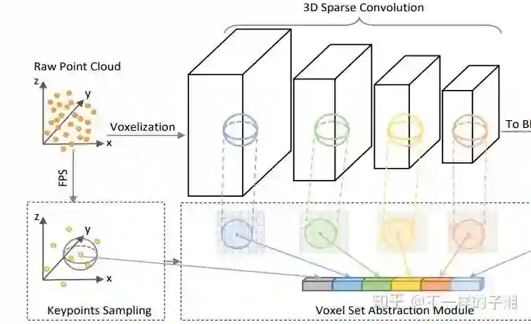作者自行设计了Voxel Set Abstraction (VSA) module这样的一个模块,这个模块的作用是将keypoint周围非空的voxel特征采集出来结合在一起,原文用了很多数学表达,含义大致如此。